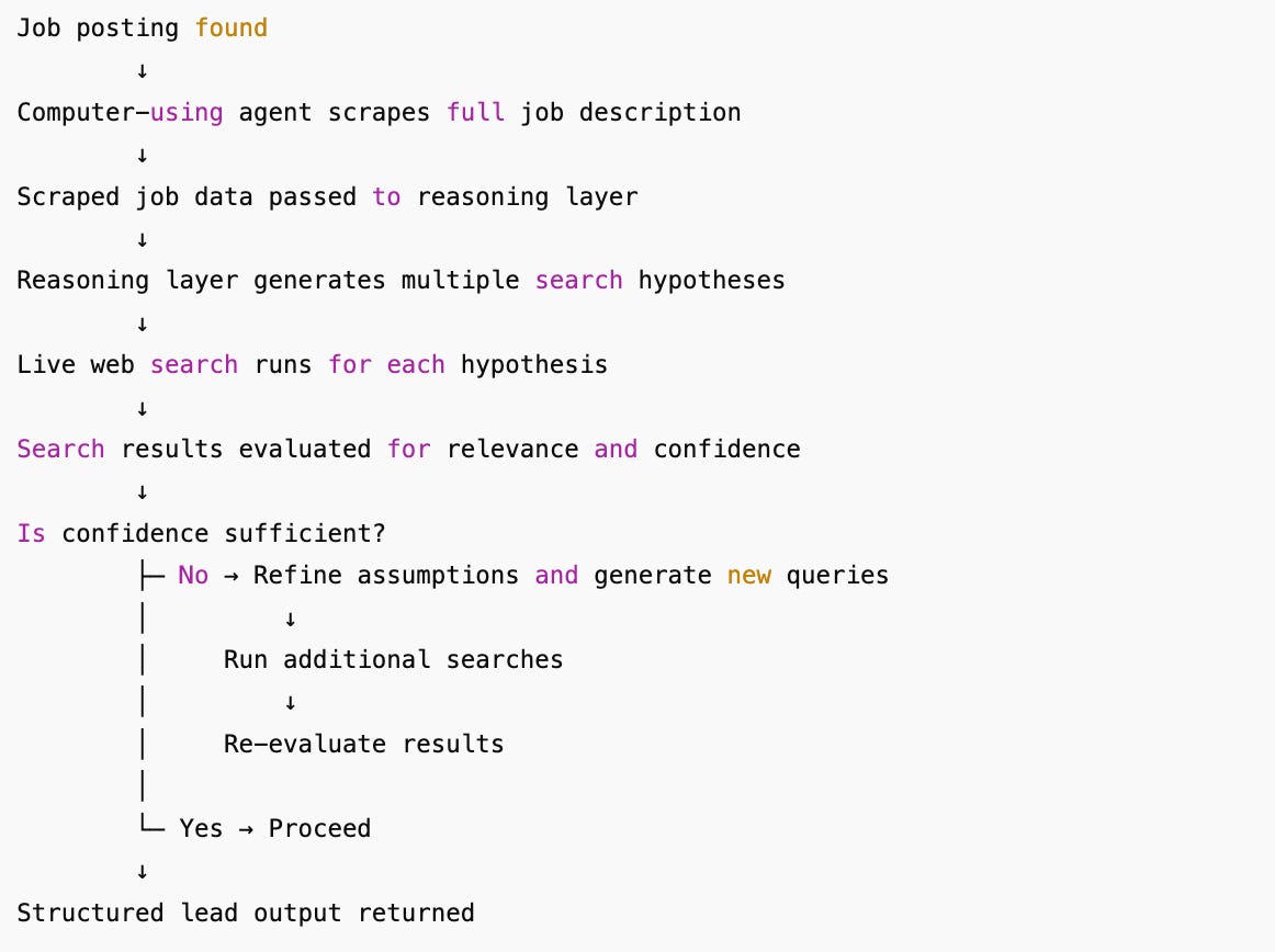 We introduced a reasoning layer that worked with the live search system. Its job was not to answer the question directly, but to decide which searches should be run. The software was able to reseach multiple hypotheses based on the job description and searched for evidence to confirm or rule each one out.After each round of search, the system evaluated the results. This process repeated until the system reached a sufficient level of confidence in the outcome.